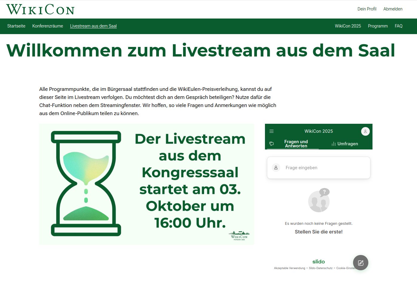 Die Programmpunkte, die im Bürgersaal stattfinden und die WikiEulen-Preisverleihung, kannst du im Livestream auf dieser Webseite unter „Livestream aus dem Saal“ verfolgen. Auf der rechten Seite des Livestream-Fensters kannst du deine Fragen/Anmerkungen direkt nach Potsdam senden.